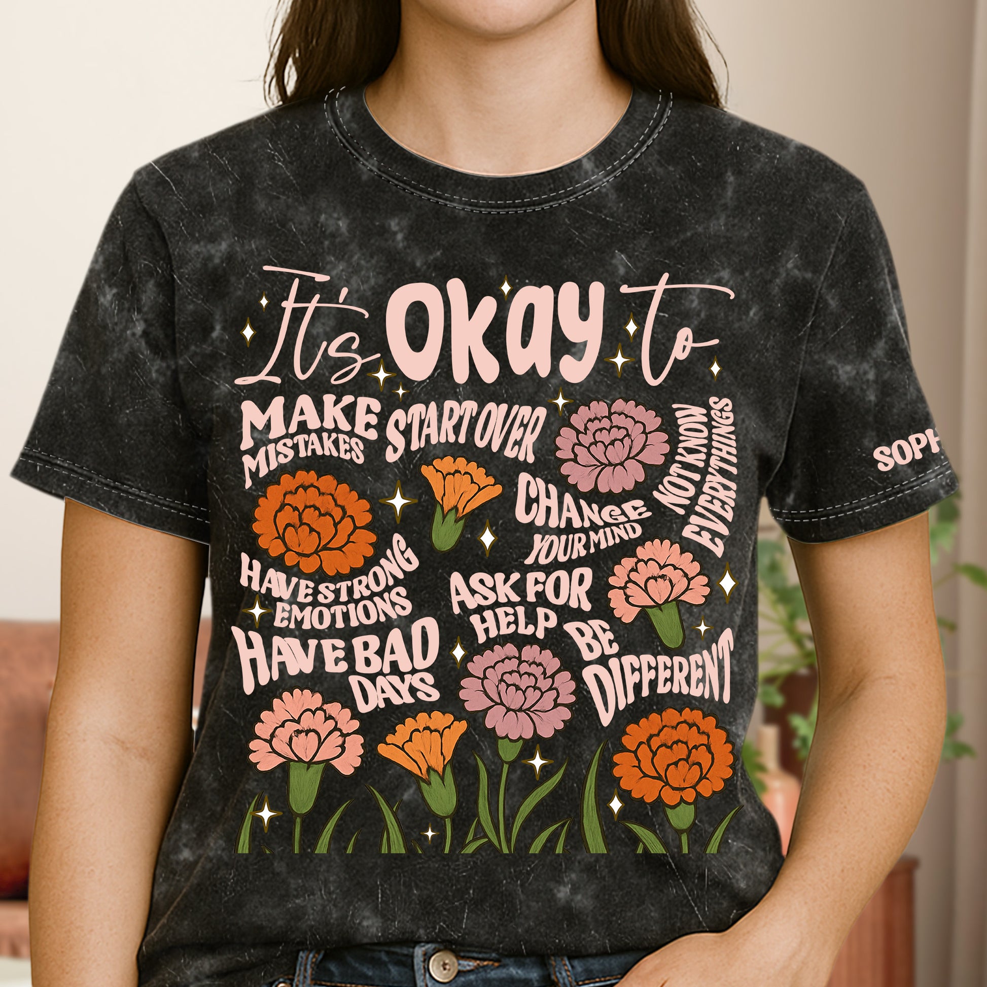 Our It's Okay To Personalized Acid Wash T‑Shirt is exactly the piece of fashionable affirmation needed by anyone brave enough to be themselves. This trendy Acid Wash T‑Shirt carries an empowering message that implies the freedom to make mistakes, start afresh, embrace change, and own one's unique self. This shirt is more than fabric, it's a love language to ourselves, making it a great self-care gift for anyone who wants to celebrate their individuality. It’s perfect for birthdays, anniversaries, Christmas, or just an ordinary day when a little self-love is in order.