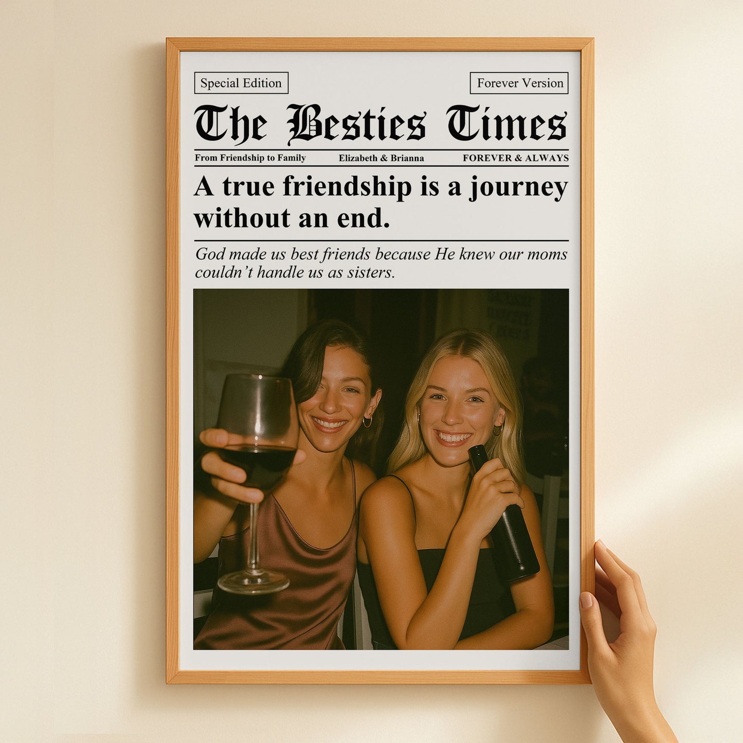 Cherish and preserve your special memories with our custom Poster product: "Newspaper The BFF Times". This unique poster serves as an exquisite reminiscence of those beautiful moments spent with your best friend. It's not just a regular poster; it's a canvas for your heartwarming memories, where you can upload your favorite photo of you and your bestie. This sentimental product is a perfect embodiment of your friendship - a testament to shared secrets, shared dreams, and shared experiences.